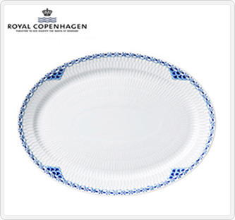 美しいレースの縁取りとレリーフで飾られたプリンセス。このシェイプと手描きのパターンは、1888年に、ロイヤル コペンハーゲンのアートディレクター、アーノルド クローによってデザインされました。 美しい縁取りの絵付けがティアラのように見えることからプリンセスと名付けられました。