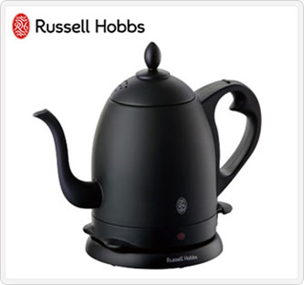 1952年生まれの電気ケトルの代名詞的存在「ラッセルホブス」。カップ1杯分(130ml)なら約60秒で沸騰、満水時(800ml)でも約4分で沸騰します。コーヒーポットのような細長い注ぎ口は湯量を調節しやすく、コーヒーを淹れる時にも便利です。空焚き防止機能、オートオフ機能付き。