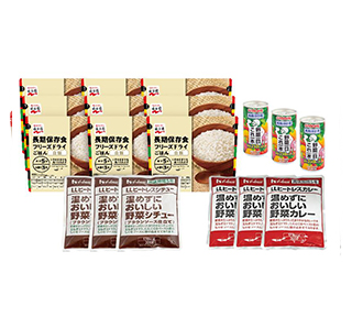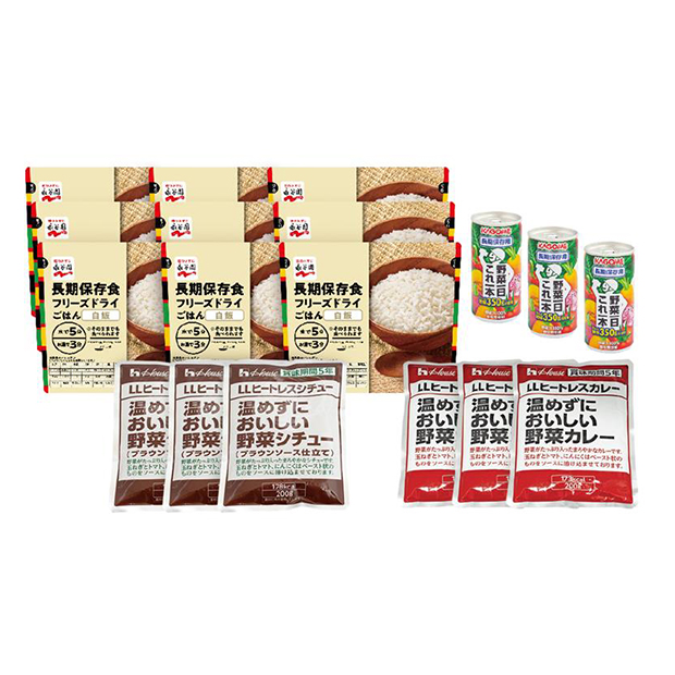 永谷園が開発したフリーズドライご飯を中心にバラエティーに富んだ災害用備蓄食品セットです。白飯にカレー、シチューをかけて召し上がれます。また野菜ジュースを白飯にかけてリゾット風にも召し上がれます。