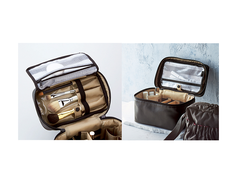 内容:内部/ファスナー式ビニールポケット×1・ブラシホルダー×5・ホルダー×8・テープ式中仕切り×2・ゴムストラップ、開閉部ファスナー式