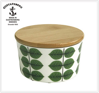 1950-70年代に活躍したスウェーデンを代表するデザイナーの一人、Stig Lindberg(スティグ リンドベリ)によるデザインの蓋つき容器。 “BERSA”はリンドベリがデザインした中で一番人気の柄。グラフィカルに並んだ緑の葉っぱが印象的です。蓋つき容器はお砂糖やキャンディを入れたり、蓋を外してボウルとしてもお使いいただけます。こちらはスウェーデンの磁器ブランド “GUSTAFSBERG(グスタフスベリ)”社で、リンドベリが活躍していた時代の生産ラインを使い手作りに近い形で作られています。そのため、一つ一つのサイズや厚みが微妙に違っていたり、ゆがみやプリントのかすれなど、ひとの手が生み出す製品の温かみが感じられます。