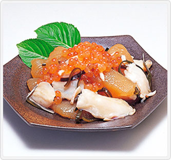 北海道・道南地方発祥の郷土料理である松前漬をベースに、大ぶりの数の子、食感のよいロコ貝、北海道産秋鮭のいくら・昆布・するめをじっくりとタレに漬け込み、贅沢な松前漬に仕上げました。素材本来のうまみと、かつお節・こんぶのエキスを加えた風味豊かな醤油ダレの味わいをご堪能ください。