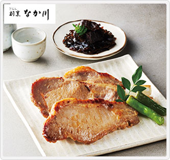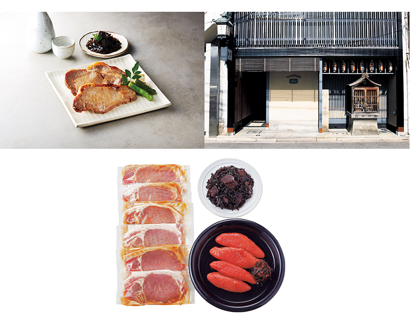 西京味噌の味噌ダレを使用した豚肉、お茶漬けなどでお楽しみいただけるうなぎ昆布、柚子風味の明太子のセット。