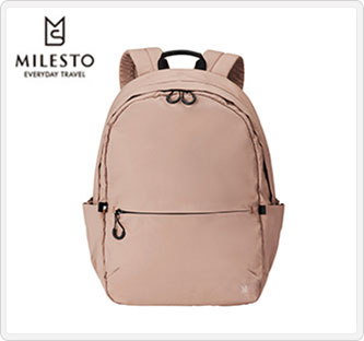 収納力・軽さ・耐水性に優れたミニマルデザインのバックパック。内装には13インチのノートPCが収納できるクッション付きスリーブポケットと2つの小物ポケットを搭載。外装にはすぐ取り出したい物の収納に便利なフロントポケット、ペットボトルや傘を収納できる両サイドのポケット、背負ったまま物を出し入れできる背面のファスナーポケットを搭載し、ミニマルなデザインとは裏腹に使い勝手を考え抜かれたポケットの配置が魅力です。背面にはキャリーオンできるテープ、持ちやすく掛けやすい革ハンドルを装備。トラベルやデイリー、ビジネスユースまでさまざまなシーンに寄り添います。