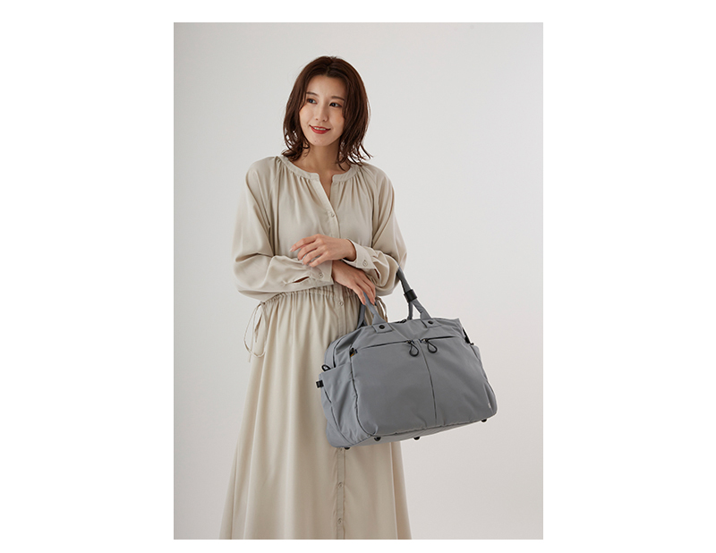 収納力・軽さ・耐水性に優れたミニマルデザインのダッフルバッグ。ワイドオープンで荷物の出し入れがしやすく、ファスナーメッシュポケットと2つの小分けポケットですっきり収納上手。外装には仕分けに便利な2つのフロントポケット、ペットボトルや傘を収納できる両サイドのポケット、キャリーオンにも対応する背面のファスナーポケットを搭載し、ミニマルなデザインとは裏腹に使い勝手を考え抜かれたポケットの配置が魅力です。持ち手をまとめたり、マスクや帽子を引っ掛けることができる革バンド付き。付属のショルダーストラップを取り付けて肩から掛けることも可能です。旅行はもちろんのこと、ジムバッグやマザーズバッグとしても重宝します。