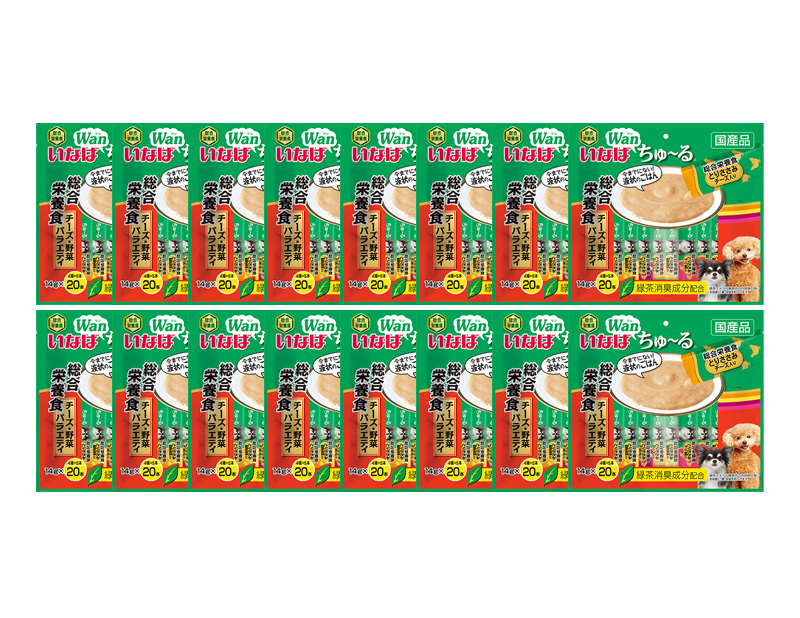 鶏肉(ささみ)、鶏脂、チーズ、チキンエキス、酵母エキス、タンパク加水分解物、増粘安定剤(加工でん粉、増粘多糖類)、ミネラル類(Ca、Fe、Cu、Mn、Zn、I、K)、ビタミン類(A、D3、E、B1、葉酸、B12、コリン)、キトサン、紅麹色素、緑茶エキス