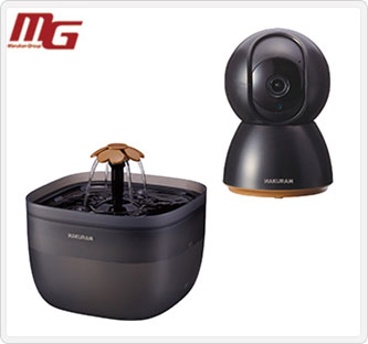 決められた時間にご飯を出せるオートフィーダーと軟水化フィルター付きのウォーターファウンテンと見守りカメラのセットです。