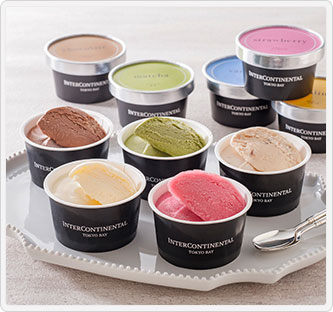 素材の味が引き立つよう作りあげたなめらかな口どけのアイス。定番のバニラの他に、シェフおすすめのプラリネなど5種類のフレーバーをセットにしました。