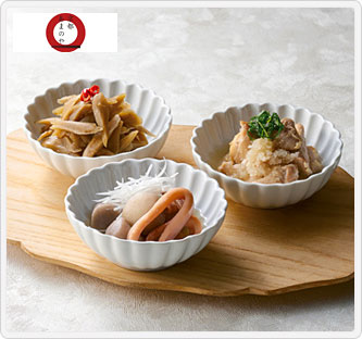 内容量:切干大根100g・ごぼう金平100g・豚肉と大根の味噌煮100g・大豆五目煮100g各2、いか小芋100g・鶏みぞれ煮100g・ひろうすと小松菜の煮物100g・じゃこ甘唐辛子100g各1