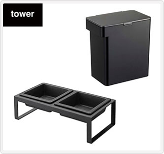 フードとお水や、2種類のフードなど、自由に組み合わせて使えるボウルとスタンドのセット+リビングやキッチンにそのまま置けるスタイリッシュなペットフードストッカー。