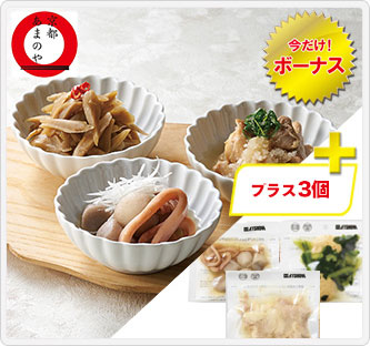 キャンペーン期間中、今だけボーナスとして3個(いか小芋、鶏みぞれ煮、ひろうすと小松菜の煮物)増量いたします。