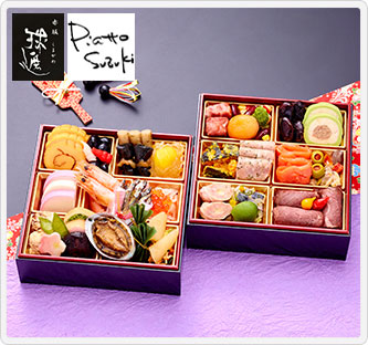 少人数でも和と洋のメニューが一度に楽しめる贅沢なお節です。アワビやローストビーフなど豪華なメニューがそれぞれ重箱に盛り込まれています。