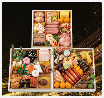 おせちの定番献立にあわび姿煮を盛り込んだ、華やかな和洋折中の三段重おせちです。ローストビーフ、焼海老、ぶり照焼、たこ照焼などを中心に贅沢な食材をお楽しみいただけます。