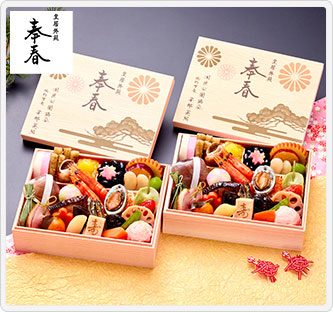 〔壱の重〕〔弐の重〕かまぼこ(白)1切、かまぼこ(紅)1切、たたきごぼう5個、バイ貝旨煮1個、きんとん25g、栗甘露煮1個、黒豆煮20g、桜色麩1枚、アワビ旨煮1個、伊達巻1切、紅あずま甘露煮1切、白花豆煮2個、若桃甘露煮1個、煮はまぐり1個、祝海老2尾、紅白なます20g、いくら醤油漬3g、蓬麩1個、ドライトマトワイン煮1個、合鴨スモーク串1枚、金柑甘露煮1個、笹巻茶巾(柚子あん)1個、一口にしん昆布巻1個、花形人参1枚、味付数の子1切、田作り5g、ぶり照焼1切、てまり餅1個、寿高野豆腐1個、椎茸煮〆1個、蓮根煮〆1個、人参煮〆1個、きぬさや1本、えびと枝豆のしんじょ1個