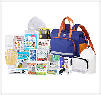 セット内容:避難用リュック、ホイッスル、9光ライト(電池別売)、レインコート、携帯トイレ(大小兼用)1P、ウェットティッシュ(20枚)、静音エマージェンシーブランケット、生理用ナプキン(8入)、シャンプー手袋、長期保存ボディタオル、簡易ポンチョ、防災ハンドブック、スクエアポーチ、マスク、ポケットティッシュ×2、あぶらとり紙、軍手、綿棒10P、エイトバン(大小×各2)、熱冷却シート(2枚入)、衣類収納巾着袋、ソーイングセット、使い捨てカイロ