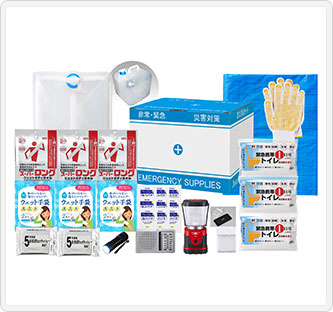 セット内容:LEDランタン(電池別売)、9光ライト(電池別売)、AM・FMラジオ(電池別売)、モバイルチャージャー(乾電池式・電池別売)、ウォータータンク20L、ウェットボディタオル×3、シャンプー手袋×3、ウェットティッシュ(20枚)×2、ペーパー歯磨き×9、携帯トイレ1日用パック(6回分)×3、ブルーシート(1,800×2,700mm)、軍手