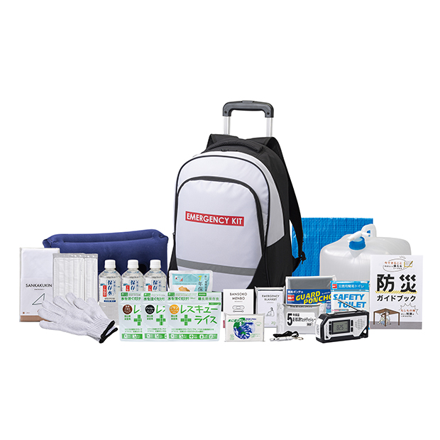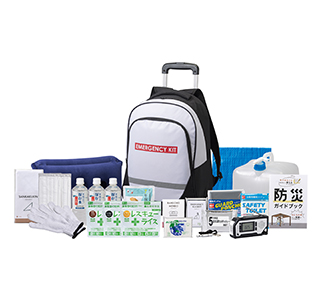 便利なキャリーカート付き防災リュックを始めとした避難時に生き抜くための防災セット。