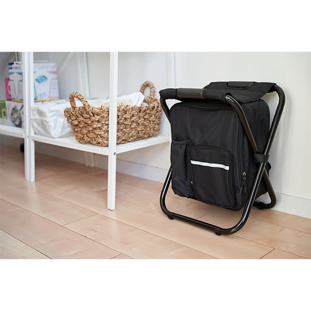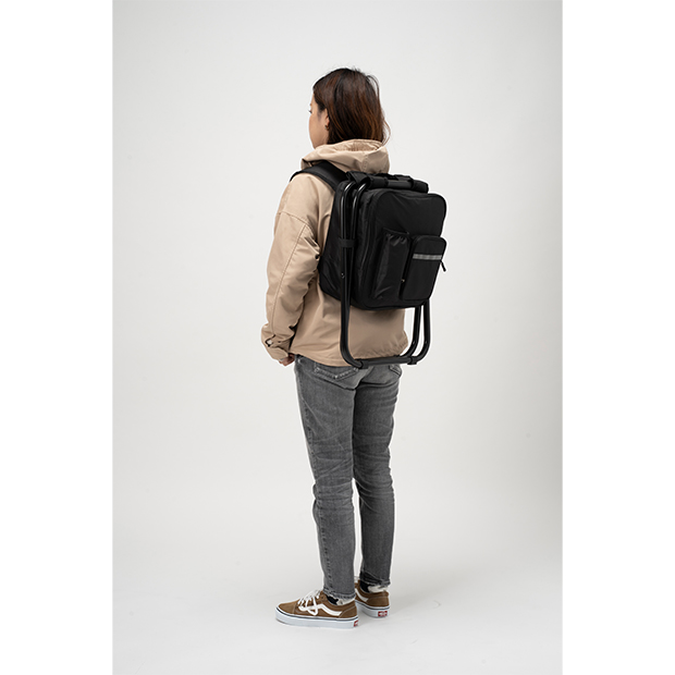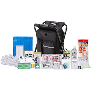 「イス」として避難所や災害時の行列などで活躍する便利なリュックの防災セット。リュックは水をはじく撥水加工素材を使用。