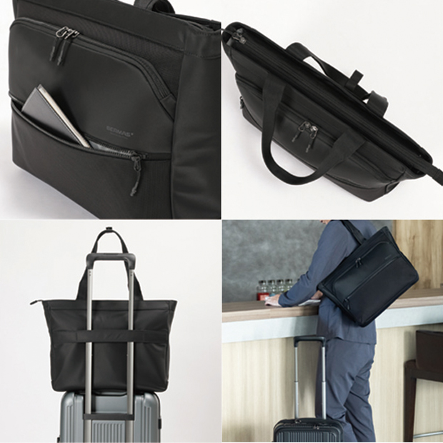 天ファスナー付きで中身が見えず防犯面も安心。さらにキャリーオン機能を備え、出張や旅行にも便利にお使いいただけます。