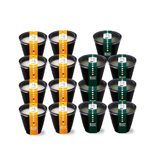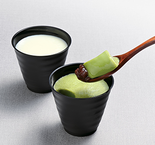 ミルクプリンに宇治抹茶を加えた抹茶プリンに、十勝産小豆の粒餡を入れた小豆抹茶プリンのセット。