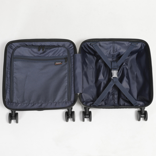 ワンタッチで開閉可能な新機構フロントパネルを搭載し、スムーズな荷物の出し入れが可能に。静音性と走行性を両立したHINOMOTO製の大径60mm Lisof® SILENT RUNダブルホイールキャスターを採用。側面のスライドスイッチで前輪のロック・解除も簡単に操作できます。強度と弾力性に優れたポリカーボネート100%素材を使用し、リブデザインが傷を目立ちにくくします。ロストバゲージ対策に有効な「TRAVEL SENTRY ID」も装備。