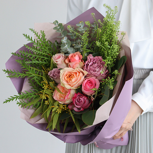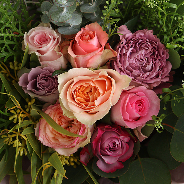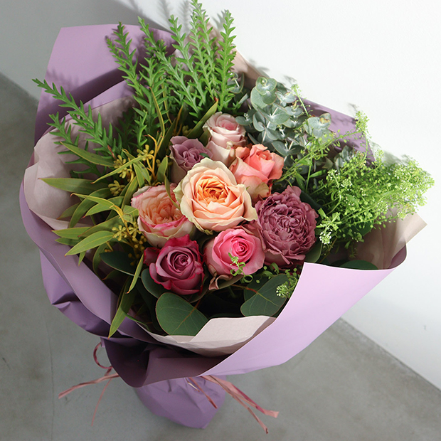束ねるバラは、赤道直下に位置するケニアの、標高2,400メートルに位置するバラの栽培に最適な場所から届きます。世界の花屋のために、一本一本大切に育てられたバラは、他にはない、しっかりとした太い茎に大きな花をつけるのが特徴的で、ケニアの自然のダイナミックさをそのままバラで表現したかのようです。一緒に束ねるグリーンは、世界各国から集めたユーカリやグレビレアなどをセレクト。ほのかにグリーンの爽やかな香りもお楽しみいただけます。
