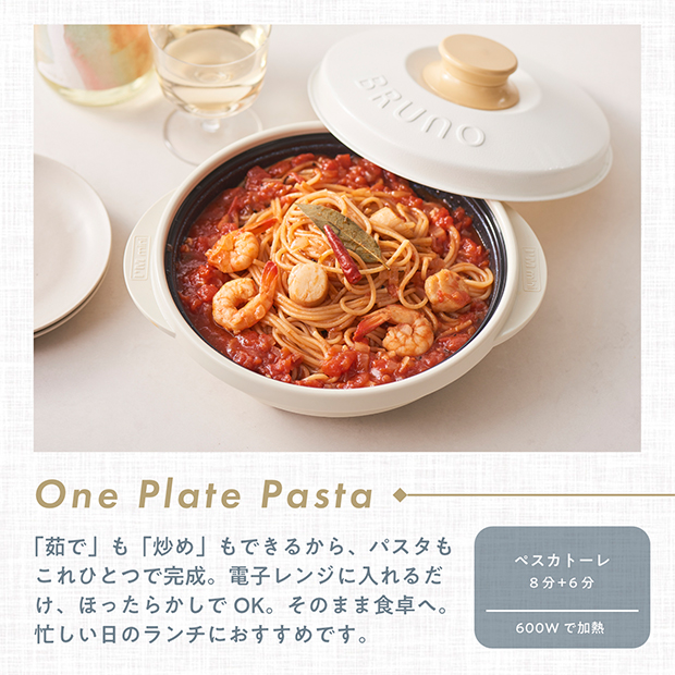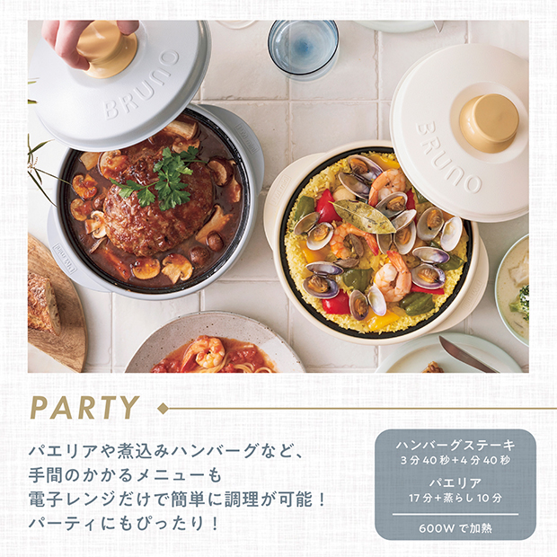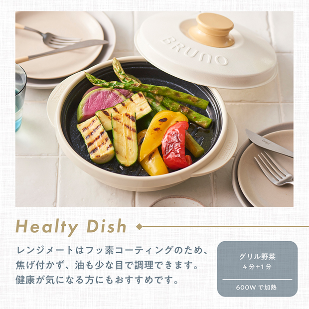 初のコラボレーション商品「RANGEMATE PRO by BRUNO」火を使わずに電子レンジで焼き調理ができる特許構造*2はそのままに、フタに「BRUNO」のロゴが施されております。あたたかみのあるデザインで、インテリアや調理シーンにもぴったり。新しい生活を迎える方へのプレゼントにも喜ばれる製品です。