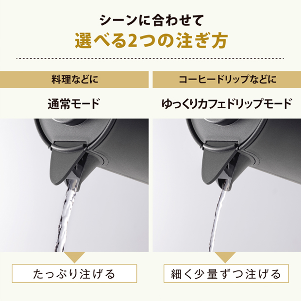 また、たっぷりも、ゆっくりも、選べる2つの注ぎ方ができ、通常モードはカップ麺や調理に、ゆっくりカフェドリップモードはドリップコーヒーや離乳食にと日常の幅広いシーンでお使いいただけます。