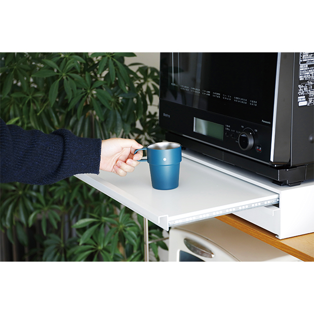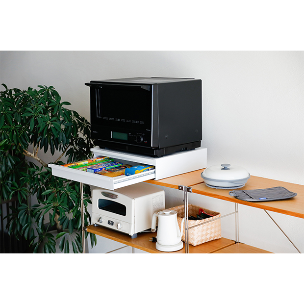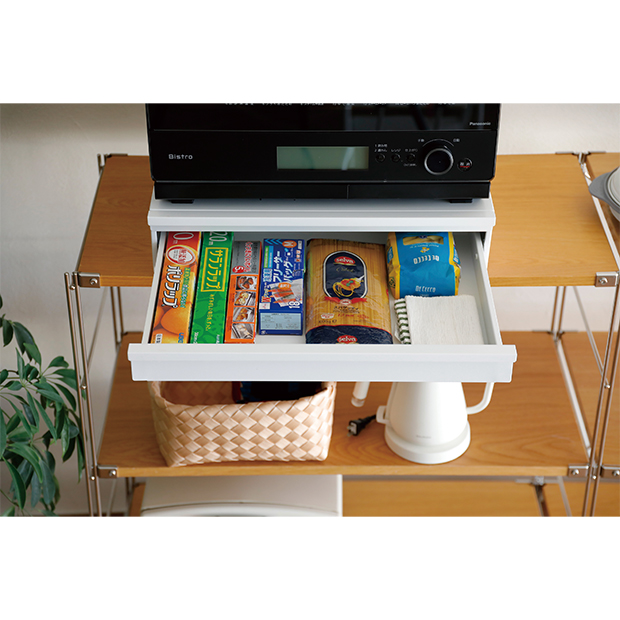 炊飯器やトースターなどの家電を載せたまま、下部の引き出しにラップやキッチンツール、コーヒー用品などの小物をすっきり収納でき、散らかりがちなキッチンまわりをスマートに整理整頓できます。