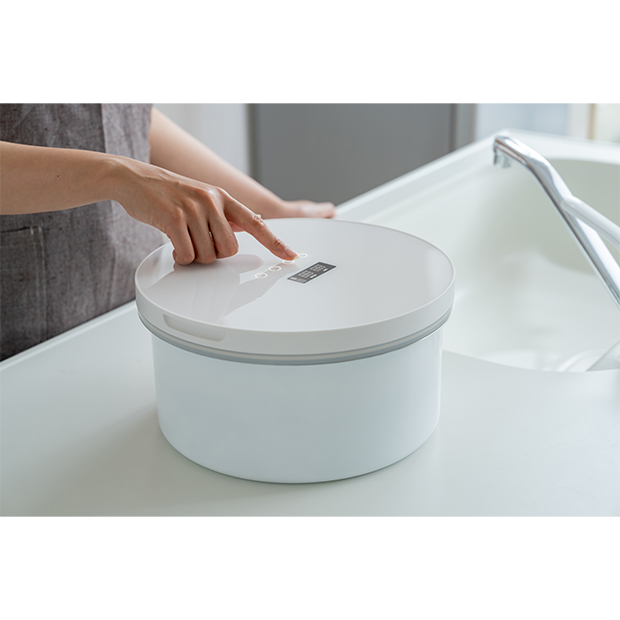 ボタン一つで自動真空できるステンレス素材の保存容器。