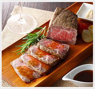 松阪牛のモモ肉のなかでもローストビーフに適したやわらかく良質の部位だけを使用しています。ローストビーフは本来赤身のお肉を原料としますが、松阪牛は品質に優れ、きめが細かく、やわらかい上に赤身肉でも適度に霜降りが入ります。この霜降りがローストビーフ本来のお肉の味にしっとりとした滑らかな食感と豊かな風味を与え、1クラス上の食体験をお届けします。