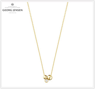 2粒の18Kイエローゴールと1粒のブリリアントカットダイヤモンドを組み合わせた、繊細で上品なペンダントです。ジョージ ジェンセンの伝統を体現したエレガントなデザインが、タイムレスな美しさを放ちます。ムーンライト グレープ(Moonlight Grapes)コレクションは、ジョージ ジェンセンの初期のアールヌーヴォー作品に見られるブドウのモチーフを、現代的に抽象化したデザインです。ペンダントはK18イエローゴールドと0.07ctのダイヤモンドを使用しています。細いチェーンが付属しています。