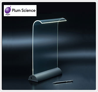 台座にはLEDが隠れており、カーブした透明アクリル板の中を光が通り、その先端から均一に照らします。