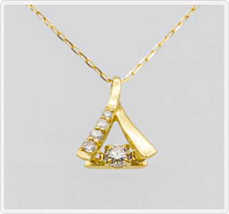 三角形は、角を上向きにすると上昇や成長という意味に、角を下向きにすると地に根ざす、しっかりと足を大地に付けるという意味があり、多くの世代に好まれるデザインです。また、揺れに併せて輝く0.1ctダイヤモンドがさり気なく大人感を演出。左上部にもダイヤモンドをあしらい、高級感のある仕様で大切な人へのプレゼントにも最適です。素材は本体・チェーンともジュエリーに人気のK18を使用、さらにチェーンは丈夫なアズキチェーンを採用。ペンダントトップの輝きをより引き立ててくれます。
