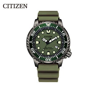シチズン独自の光発電技術「エコ・ドライブ」を搭載。水深200mまでの耐圧性と長時間水中に耐える防水性を備えています。