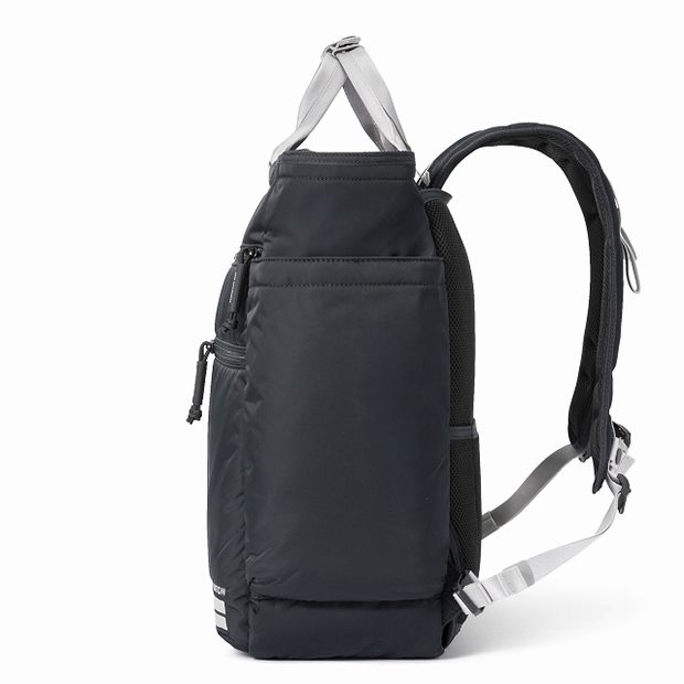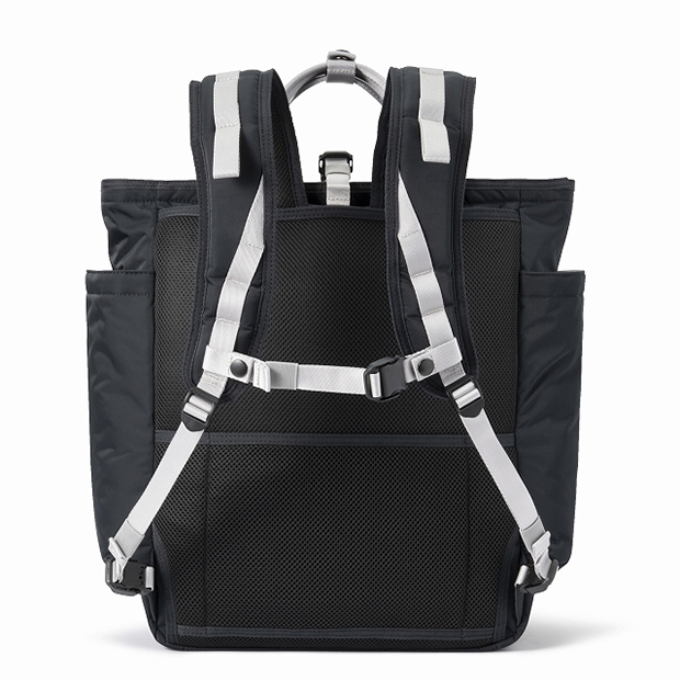 ショルダーハーネスは背面メッシュ部にすっきりと収納可能。クラブハウスではハンドバッグとしても活用できる2Way仕様で、場面に応じた使い分けが可能です。さらに、背面メッシュ部にはスーツケースへのセットアップ機能を搭載。大容量であることから、旅行の際のサブバッグとしても頼れる存在です。