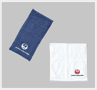 フライトアイコンの刺繍を施した、JALオリジナルの今治タオルの2点セットです。(今治ハーフハンカチ ストライプ ネイビー、今治ハンカチタオル)