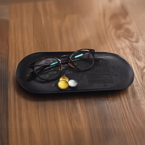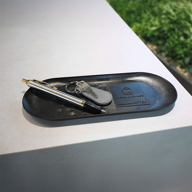 退役したJA772Jは、羽田空港の格納庫で解体され、その尾翼の一部がリサイクル処理を施されました。リサイクル工程では、CFRP からプラスチック成分のみを除去し、炭素繊維(カーボンファイバー)だけを回収。その後、回収した炭素繊維と植物由来のポリアミド樹脂を混合して成型したものが本製品です。筆記用具などの身の回りの小物を置くトレーとしてご使用ください。