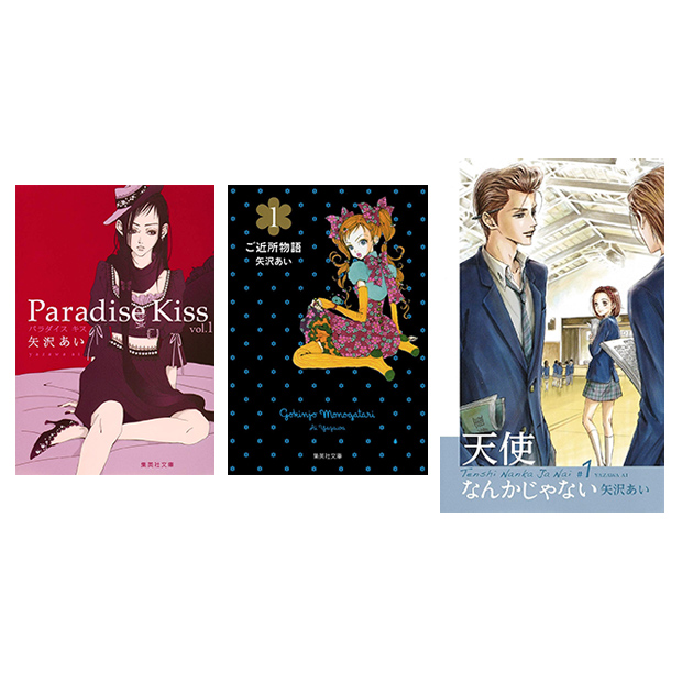 集英社文庫(コミック版)「Paradise Kiss」1~4巻「ご近所物語」1~5巻 愛蔵版コミックス「天使なんかじゃない 新装再編版」1~5巻/矢沢あい名作3作品 〔セット内容〕 「Paradise Kiss」(集英社文庫/コミック版) 受験で頭が一杯の早坂 紫は、矢澤芸術学院(通称ヤザガク)に通う生徒達と出会って衝撃を受ける。彼らの学園祭でショーのモデルを頼まれたのだが、見た目の奇抜さからはうかがえない真摯な姿勢に打たれたのだ。彼らがアトリエと呼ぶ場所に自然と足が向くようになるが…。 「ご近所物語」(集英社文庫/コミック版) デザイナーを目指して矢澤芸術学院(通称ヤザガク)に通う実果子。お隣さんのツトムとは、生まれてからずっと一緒の幼なじみ。ヤザガクに入り、ひとりで新しい世界を広げていくツトムに、実果子は淋しさを隠せなくて…? 「天使なんかじゃない」(愛蔵版コミックス) 冴島翠は新設の聖学園に通う元気な女の子。第一期生徒会の副会長になったが、会長はなんと気になっていた須藤晃に。生徒会の初仕事が学園祭に決まり楽しい毎日を送っていたが、晃にヒロコという彼女がいることを知り…?