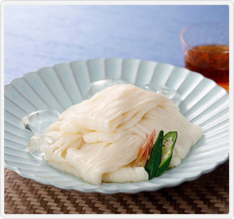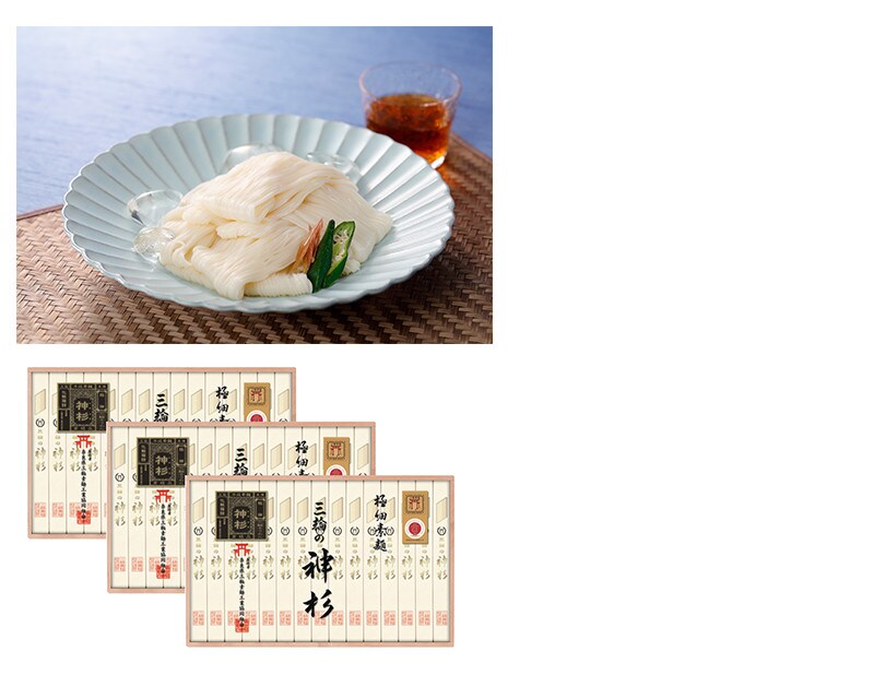 「三輪の神杉」は極細素麺として三輪を代表する最高等級品となっています。生産時期を寒時期に限定し36時間を掛けてつくられる伝統製法により極細ながらもしっかりとしたコシを味わうことができる極上の逸品です。普段味わうことのできないちょっと贅沢な素麺をぜひご堪能ください。