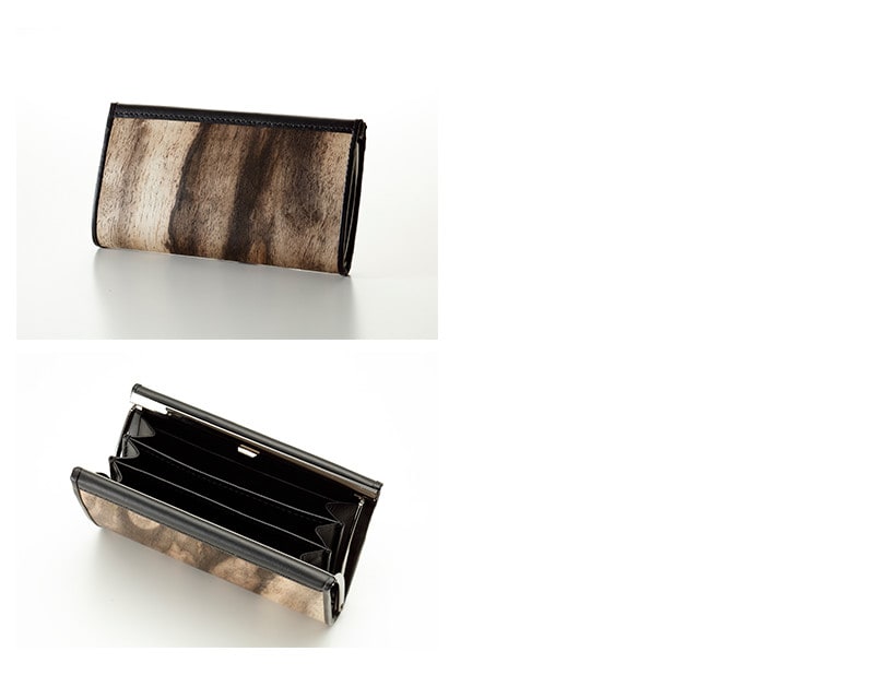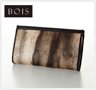 木を最大限に薄く削り、柔軟性のある素材に加工し、「縫える木」を開発しました。薄くスライスした木と革(本革)を組み合わせた世界初のバッグや小物のシリーズです。新技術を用いて、従来の「木」の製品では考えられない画期的な商品が誕生しました。ブランド名はBOISです。本体の両端を軽く押すとパッと口が開くワンタッチ式の財布です。