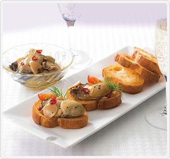 まるで生牡蠣のようにふっくらやわらか。プリプリの弾力と旨みが口の中で広がる牡蠣のコンフィです。宮島瀬戸の大粒牡蠣を、にんにくやローリエ、黒胡椒などの食材とともにオイル漬けにしました。低温でじっくり加熱する真空低温調理法により、直接火を通さないため身が縮まず、風味や旨みも逃しません。