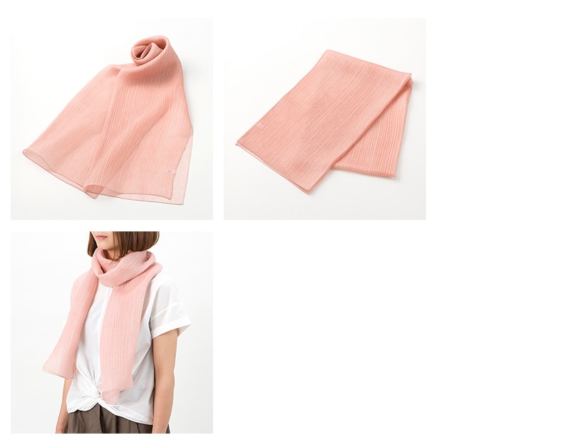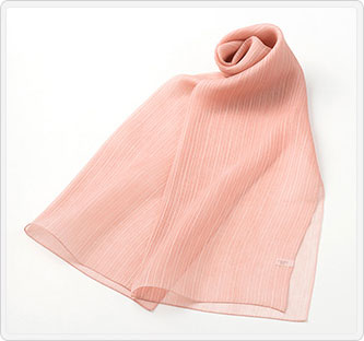 群馬県桐生市で1936年に創業した繊維メーカーの丸中株式会社と、群馬県繊維工業試験場との共同開発で誕生した特許技術を用いて製品化したストール。微粒子化した宝石を使い、静電気の原理を応用して染色しています。使用されているレッドジャスパーは、微細な石英の結晶が集まってできた宝石の一種で、日本では碧玉と呼ばれています。中でも赤色のものをレッドジャスパー(赤碧玉)といいます。古代においては世界中で装飾品や装身具などに用いられ、東アジアでは勾玉や管玉などに利用されています。