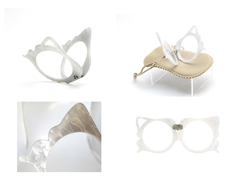 蝶の形をモチーフにした携帯ルーペ。羽を広げ広い範囲を1度に拡大して見ることができます。羽を折りたたむと1.7倍から2.3倍へと倍率が上がります。ルーペを使わない時は、可愛く飾っていただけます。鯖江の眼鏡技術を惜しみなく投入しました。透明度の高い光学用ガラスレンズは、視たいところに瞬時にピントが合うのがうれしいです。