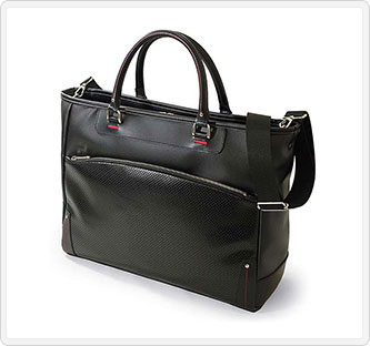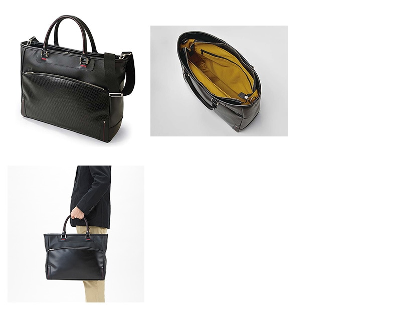 国内の鞄生産の拠点地、豊岡で生産されています。本体生地には、防水性と撥水性に優れた高耐久合成皮革を使用しているため、傷に強くお手入れも簡単。パンチングを施した付属生地と部分的に使用している赤い糸がアクセントになり存在感のあるデザインが特徴のバッグです。スタイリッシュなファスナー開閉型のトートバッグです。