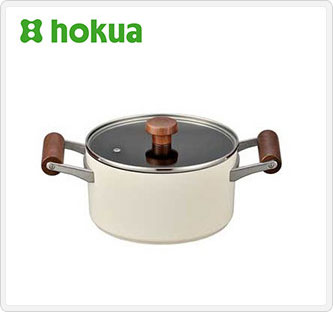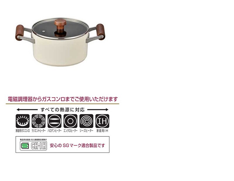 素材:本体/アルミニウム合金(AC7A)・内面/テフロンTM プラチナプラス加工・外面/セラミック耐熱塗装(ホワイト)・底面/鉄・アルミニウム溶射 はり底(200V-IH対応)・ハンドル/天然木・蓋/全面物理強化ガラス