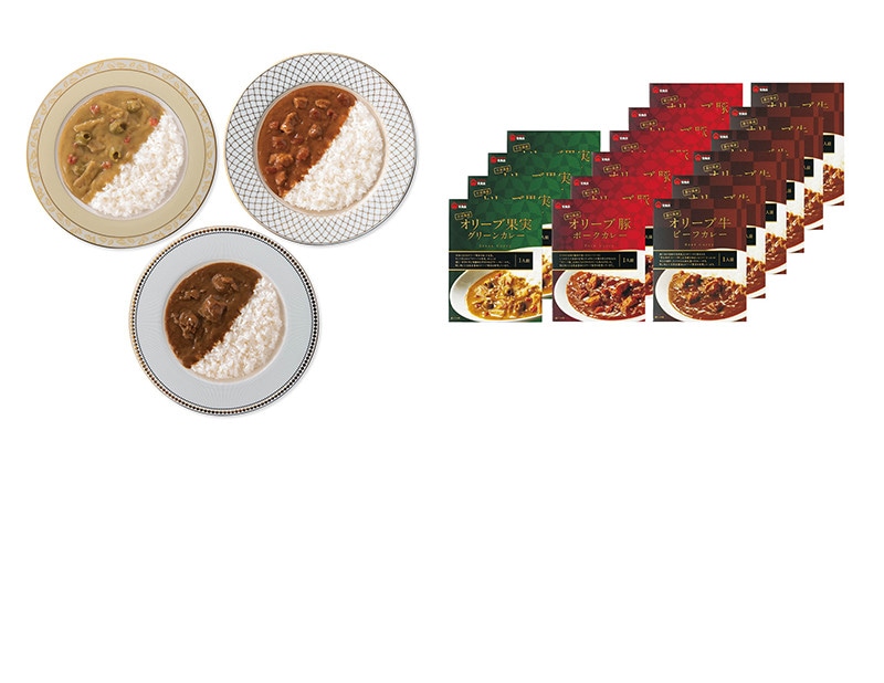 内容量:オリーブ牛ビーフカレー・オリーブ豚ポークカレー各180g×6、オリーブ果実グリーンカレー180g×4