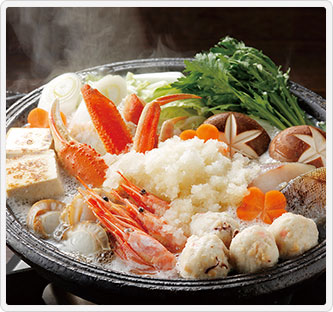 内容量:ゆでずわいがにカット400g、ボイル甘海老72g(12尾入)、ボイルほたて・かに入つみれ各120g(6個入)、ツボ抜きいか200g(2尾入)、すけとうだら切身40g×4、大根おろし30g×6、たれ50ml×3