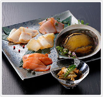 内容量:天然黒蒸し鮑80g(剥き身40g)、天然味付き長藻とあわび75g×2、天然まぐろの生ハム(赤身)・天然ふぐの生ハム・天然さけの生ハム・天然しいらの生ハム各25g