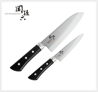料理の味を格上げする美しくすぐれた切れ味の関孫六の包丁。錆に強いステンレス3層鋼の包丁です。食器洗乾燥機に対応した樹脂ハンドルで、お手入れも簡単です。オールマイティーの三徳とペティナイフのセットです。